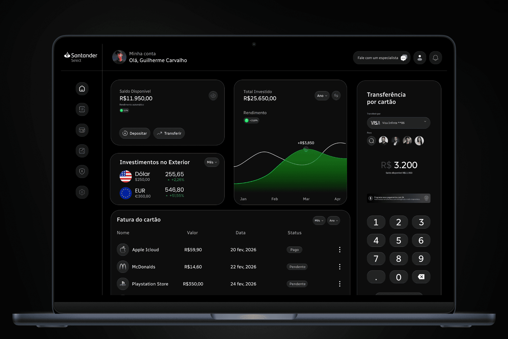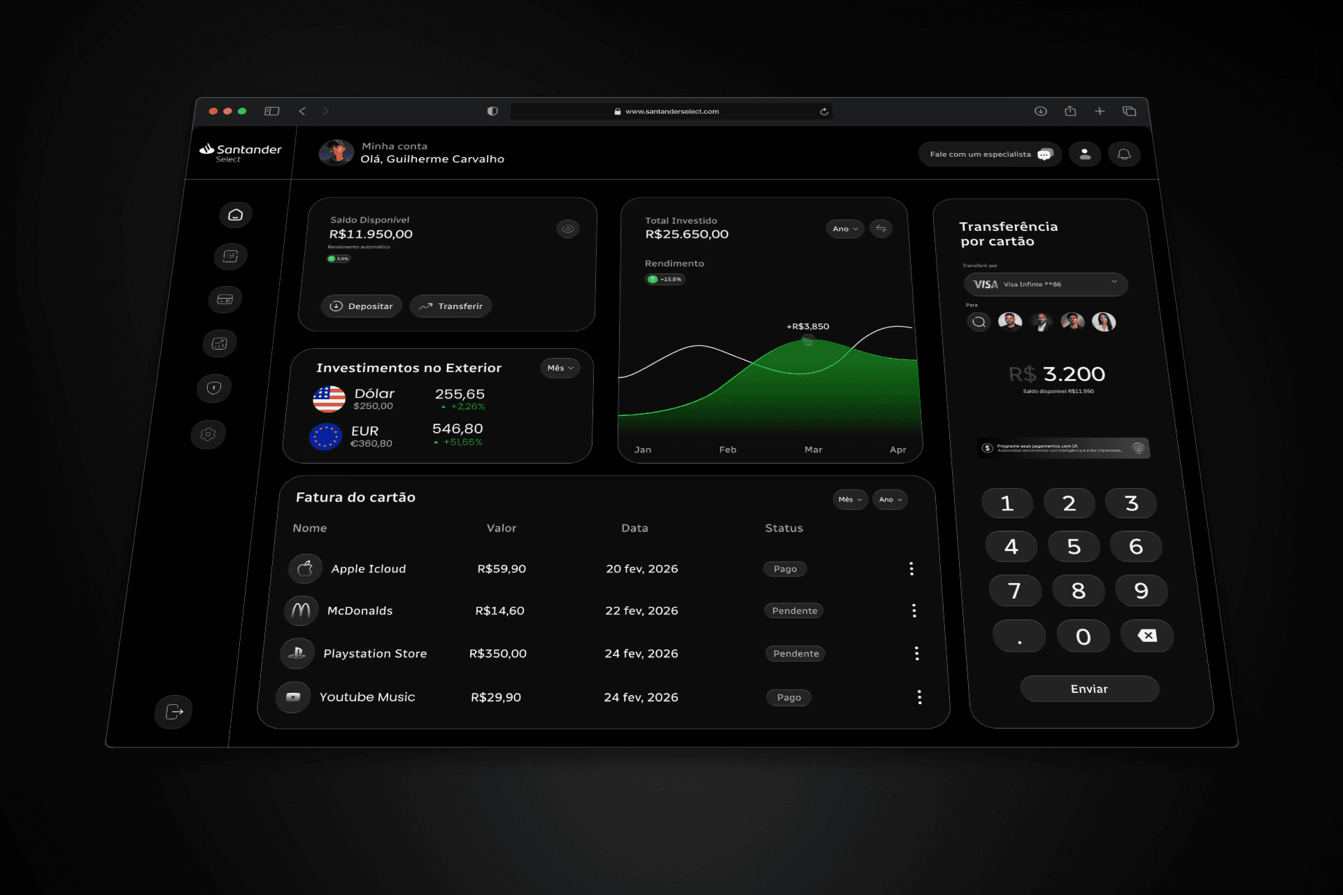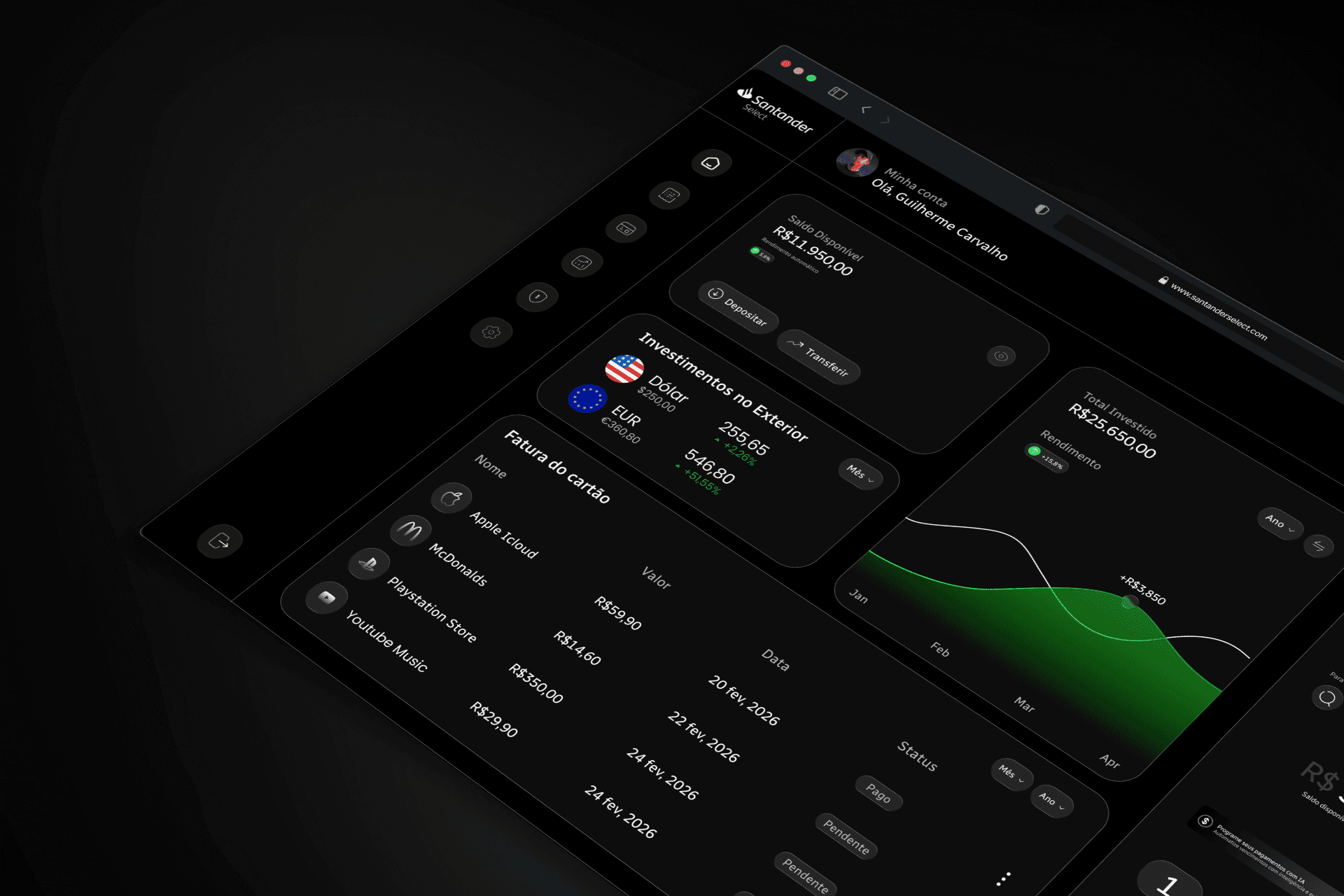 A proposta aqui foi expandir o conceito do Santander Select para o ambiente web, criando uma plataforma exclusiva para clientes de alta renda que desejam uma experiência mais completa, analítica e detalhada.