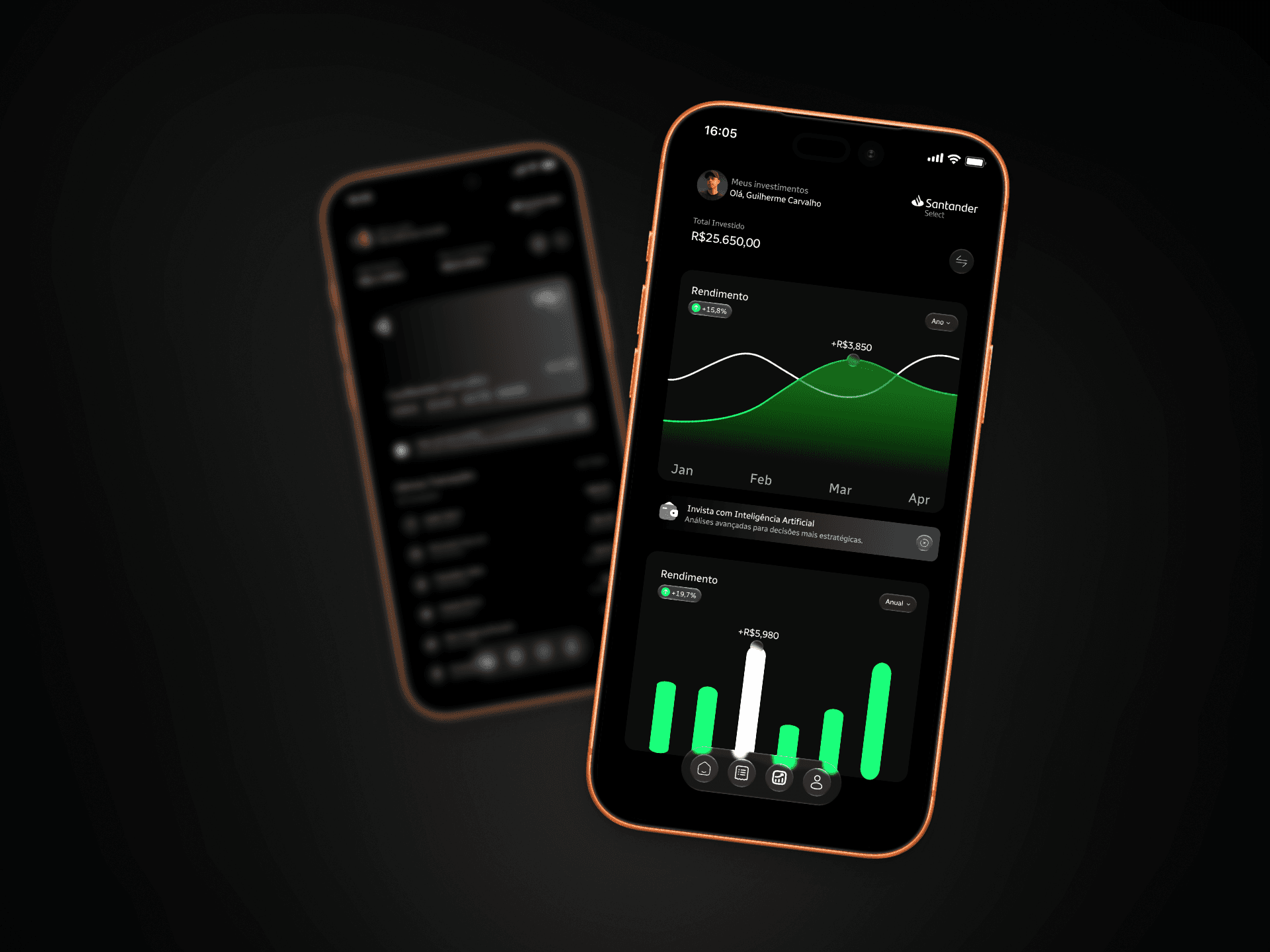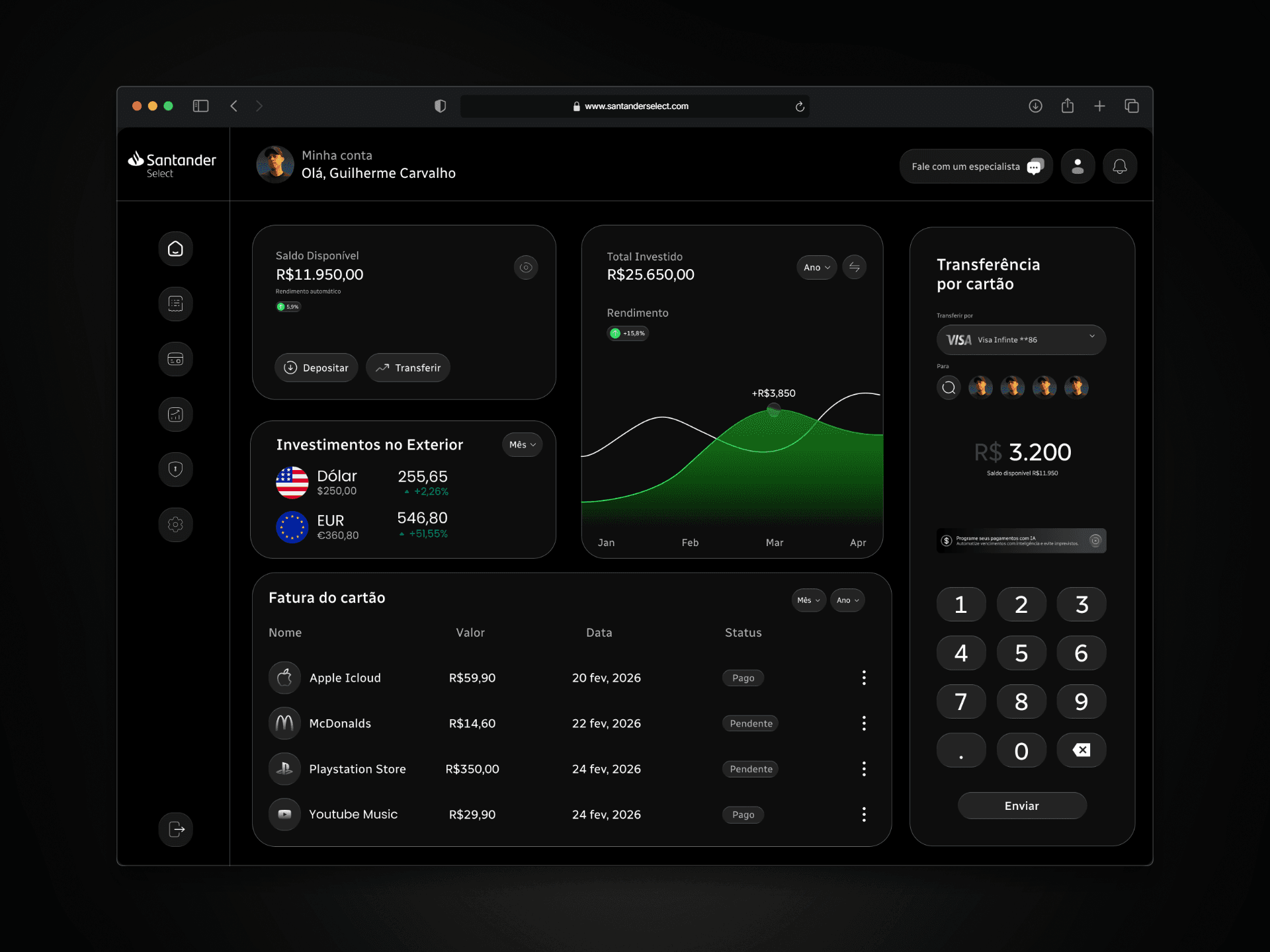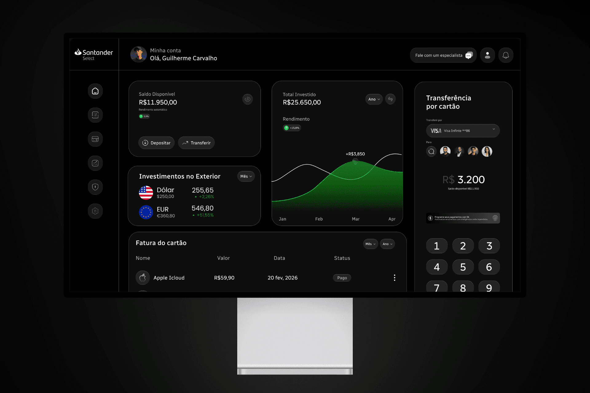A proposta aqui foi expandir o conceito do Santander Select para o ambiente web, criando uma plataforma exclusiva para clientes de alta renda que desejam uma experiência mais completa, analítica e detalhada.