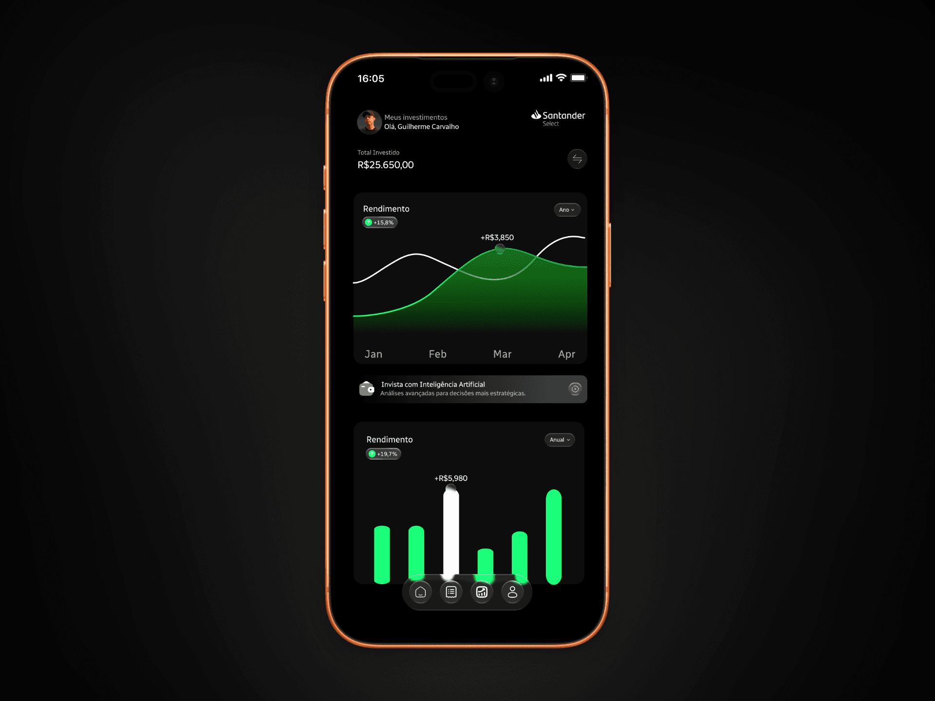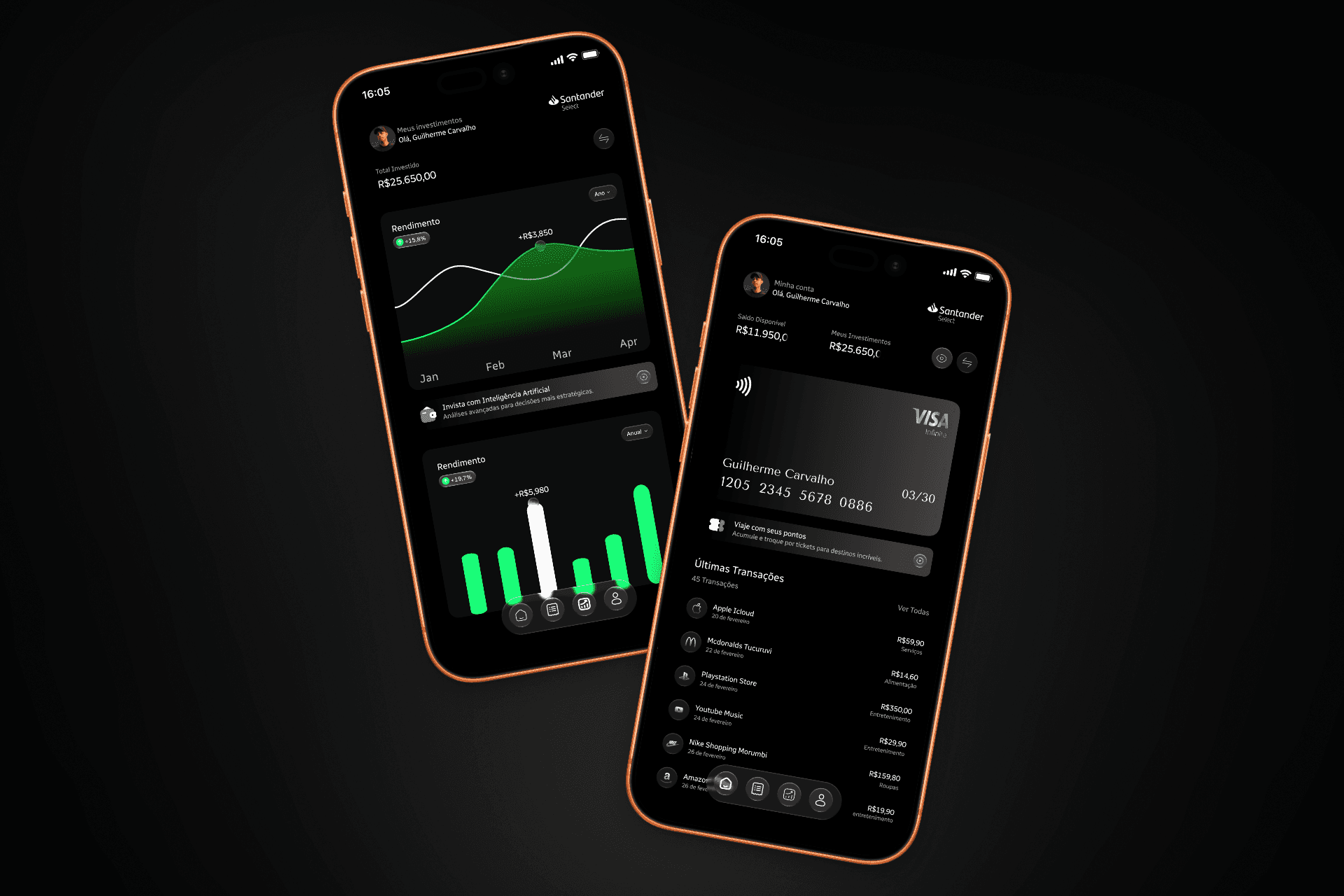 A proposta dessa tela foi transformar dados financeiros em uma experiência visual clara, elegante e intuitiva, reforçando percepção de controle e sofisticação.